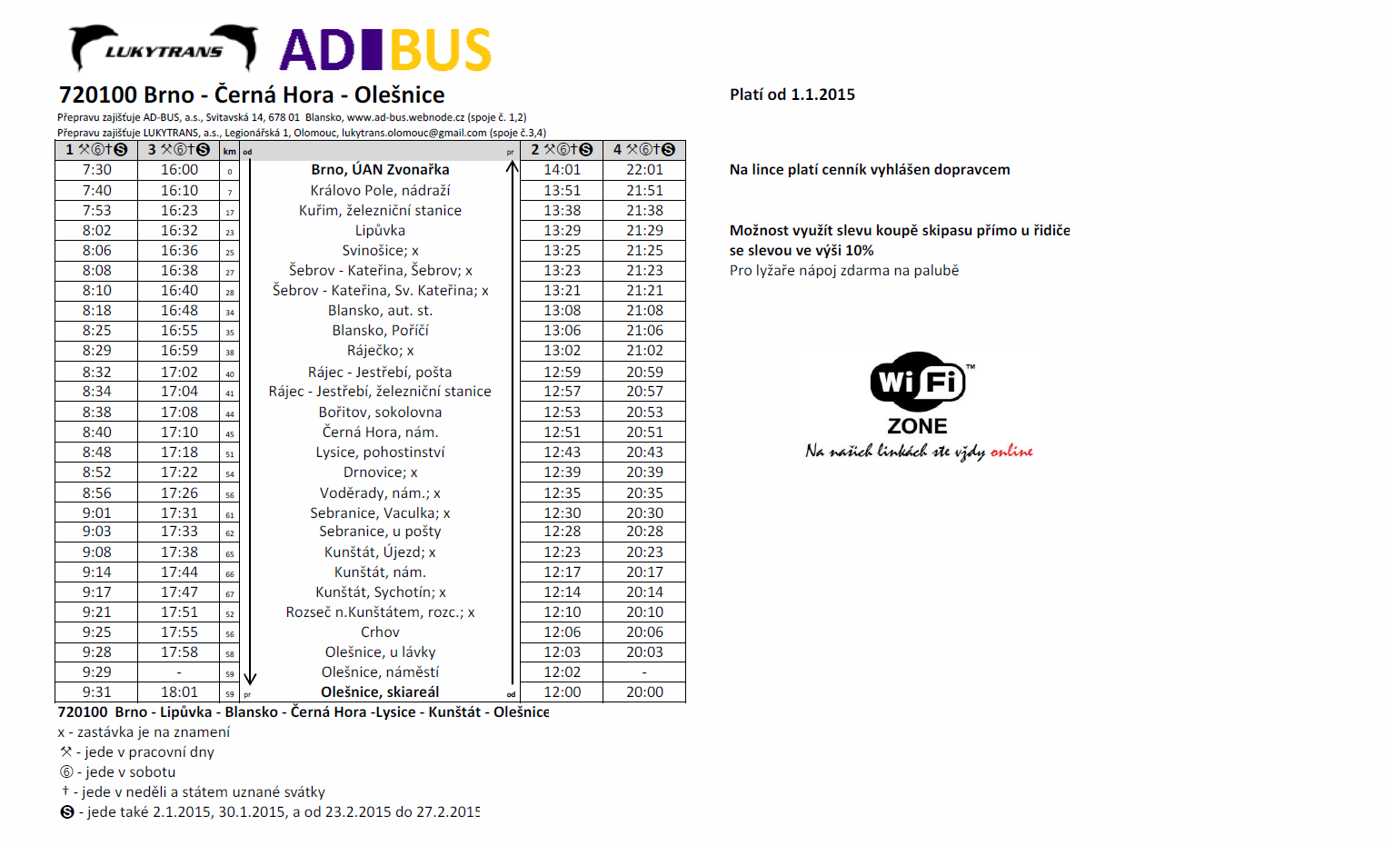 Ve spolupráci se společností LUKYTRANS (www.lukytrans.webnode.sk) pro vás od 1.1.2015 spouštíme novou linku Brno - Blansko - Olešnice. Vozit vás budeme novým autobusem IRISBUS CROSSWAY vybaveným topením, skiboxem, kávovarem a Wi-Fi. O nakládání lyží, prodej skipasů, přípravu teplých nápojů a zpříjemnění atmosféry se bude po dobu vaší cesty starat náš personál!